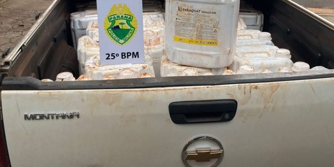 Em 28 de fev. 22, no âmbito da Operação Horus/MJ, após atendimento do 25⁰BPM/3⁰CRPM, no município de Alto Piquiri, policiais do Batalhão Ambiental, prestaram apoio a equipe RPA/25⁰BPM após constatação de transporte de agrotóxicos de origem estrangeira de nome PARAGUAT SOMAX 240 produto de uso proibido no território nacional. Diante dos fatos o responsável foi autuado em R$ 10.000,00, sendo encaminhado a PF/Guaíra para as providências criminais cabíveis.