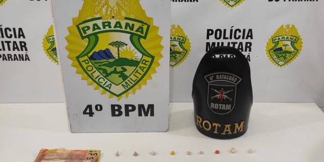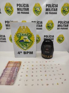 Na segunda-feira (2/5), por volta das 18h50min, policiais militares do 4º Batalhão, em patrulhamento pelo bairro Jardim São Jorge, em Maringá, avistaram um adolescente, em atitude suspeita, dispensando algo. Após abordagem, foram localizados 67 (sessenta e sete) porções de substância análoga a crack (14g) e R$145,00 (cento e quarenta e cinco reais) em espécie.