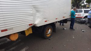 Conforme testemunhas, um motociclista seguia pela rodovia quando bateu violentamente na lateral de um caminhão baú que acabou cruzando a sua frente.