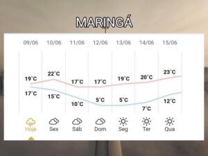 A partir deste sábado (11), os termômetros despencam com as temperaturas. Domingo há possibilidade da mínima atingir até 5°C em Maringá. A semana inicia com frio intenso e com a mesma mínima. A partir da terça-feira (14), as temperaturas começam a subir novamente, mas ainda fazendo aquele friozinho. O tempo segue estável.