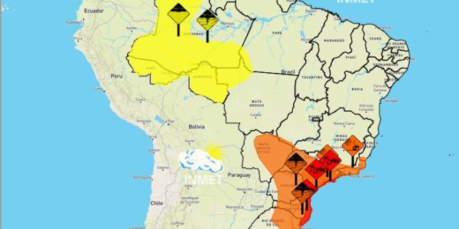 O Instituto Nacional de Meteorologia (Inmet) emitiu avisos de alerta para fortes chuvas e ventos no Paraná, Rio Grande do Sul e Santa Catarina. O litoral de São Paulo também será atingido por ventos intensos. De acordo com o Inmet, as fortes chuvas e ventos são causados pelo ciclone extratropical.