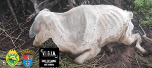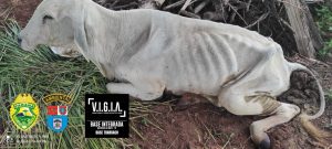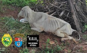 NTE O PROGRAMA V.I.G.I.A, POR MEIO DA OPERAÇÃO HÓRUS DO MINISTÉRIO DA JUSTIÇA E SEGURANÇA PÚBLICA DO GOVERNO FEDERAL, O EFETIVO DO BATALHÃO DE POLÍCIA AMBIENTAl FORÇA VERDE DA POLÍCIA MILITAR DO PARANÁ EMPREGADO NA BASE TRARBACH, POR VOLTA DAS 10H50MIN, REALIZOU ATENDIMENTO DENUNCIA ÁREA RURAL DO MUNICÍPIO DE ICARAÍMA MAIS ESPECIFICAMENTE NO PORTO CAMARGO,SENDO CONSTATADO UM ANIMAL BOVINO FÉMEA DA RAÇA NELORE DE APROXIMADAMENTE 16 ARROBAS DE 24 Á 36 MESES CAIDA , QUE FOI SOLICITADO APOIO DO VETERINÁRIO DO MUNICÍPIO DE ICARAIMA QUE CONSTATOU SEVERA DESIDRATAÇÃO GRANDE PERDA DE MASSA MUSCULAR ,POR FALTA DE ALIMENTAÇÃO, DIANTE DO EXPOSTO A GUARNIÇÃO PROCUROU PROPRIETÁRIO PARA SABER QUAL PROCEDIMENTO O MESMO HAVIA TOMADO PARA DIMINUIR SOFRIMENTO DO ANIMAL O QUAL RELATOU TER CONHECIMENTO DO ANIMAL CAÍDO E AGUARDAVA A MORTE DO MESMO PARA ENTERRAR. COM A CONSTATAÇAO DA DISPLICÊNCIA COM O MANEJO DO ANIMAL POR EN TESE TER INFRIGIDO ART 29 DO DECRETO FEDERAL 9614/08 FOI LAVRADO AUTO DE INFRAÇÃO AMBIENTAL R$ 3.000.00 E NA ESFERA CRIMINAL TERMO CIRCUSTACIADO ENCAMINHANDO AO MINISTÉRIO PÚBLICO DE ICARAIMA.