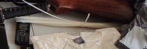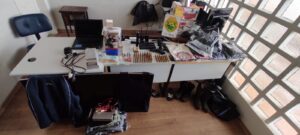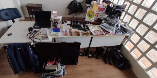 A PM de Apucarana encontrou na casa do suspeito, em Apucarana, uma pistola Glock. Carregadores alongados com capacidade para 30 tiros, espingarda com silenciador, muita munição. Um notebook roubado da transportadora de Maringá, documento falso que o suspeito tentou usar para enganar a PM, um televisor de tela grande, outros objetos a serem verificados. Contra o suspeito já pesavam dois mandados de prisão por outros crimes.