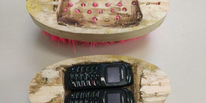 Os celulares foram colocados em uma escova de lavar roupas de madeira e foram enviados por Sedex.