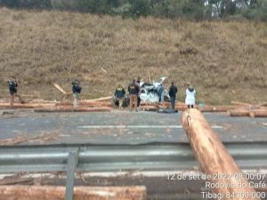 Derramamento de carga(todas de madeira) que atingiram o automóvel que vinha sentido PG.