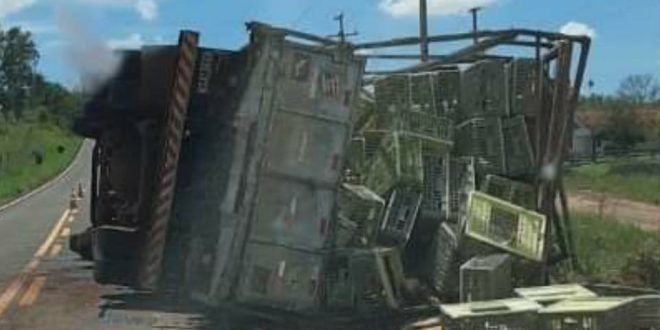 Um motorista acabou ficando ferido e precisou ser socorrido após o caminhão que ele conduzia carregado com frangos vivos tombar.IMG_0349