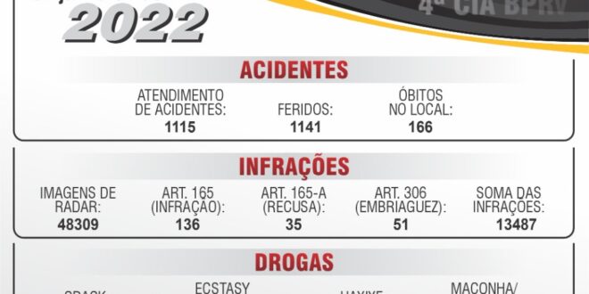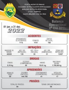 A 4° Companhia da Policia Rodoviária sediado em Maringá divulga o balanço geral das atividades operacionais do ano de 2022. Onde tivemos um total de 1.115 acidentes atendidos da qual 1.141 pessoas se feriram e 166 foram a óbito no local do acidente.
