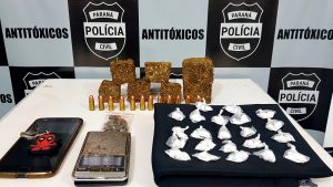 Em diligências, na residência do investigado, ainda foram encontradas mais algumas porções de fracionadas de maconha (total de 225 gramas), além de haxixe (8 gramas), cocaína (20 porções), 12 munições calibre 9mm e uma balança de precisão.