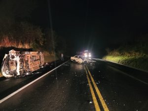 Um VW Voyage com placas de Santa Mônica/PR, conduzido por um homem de 46 anos, ao tentar uma ultrapassagem em um ônibus, colidiu frontalmente contra uma Van M.Benz Sprinter, com placas de Blumenau/SC, conduzida por um homem ainda não identificado.