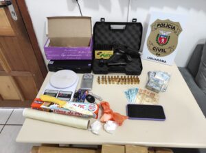 Em data de hoje a PCPR através dos Investigadores do GDE de UMUARAMA, finalizaram Operação iniciada há 15 dias, com monitoramento de um suspeito, que resultou na PRISÃO em FLAGRANTE delito de T.D.S. vulgo “Sombra” de posse de grande quantidade de Maconha, Cocaína e uma Pistola cal. 9 mm, conforme imagens a seguir.