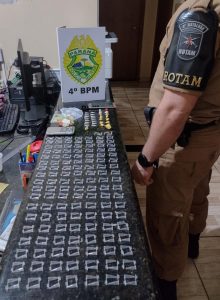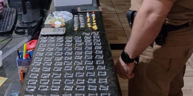 Na quinta-feira (14/04), às 14h, policiais militares do 4º Batalhão, em patrulhamento pelo Jardim Novo Centro, em Paiçandu, visualizaram um homem, em atitude suspeita, tentando dispensar algo e ao realizarem a abordagem, localizaram 3 (três) invólucros de substância análoga à cocaína. Ainda em diligências, na residência do referido homem, uma mulher tentou evadir-se e com ela foi localizada 1 (uma) porção de substância análoga a crack (1,5g) e no interior da residência do casal, foram localizados 33 (trinta e três) invólucros de substância análoga à cocaína (45g), 256 pinos vazios para armazenamento de drogas, 1 balança de precisão e 2 (dois) celulares.