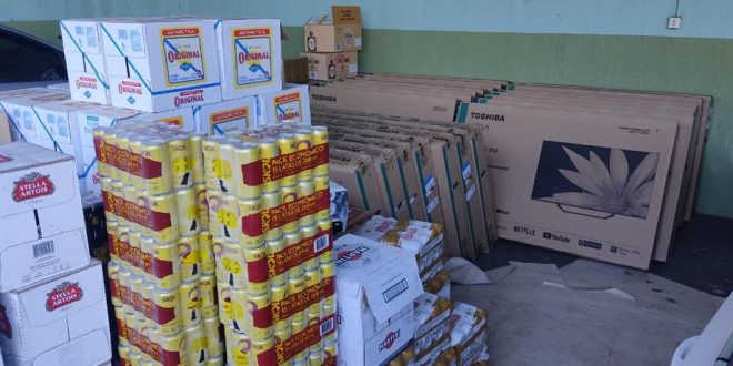 Foi dada voz de prisão ao morador de uma residência e foram apreendidas cerca de 30 tvs smart 55 polegadas com valor aproximado de três mil reais cada, além de bebidas.