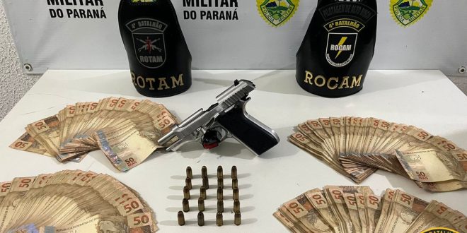 Dessa forma, os policiais militares encaminharam os dois homens (33 e 41 anos) e a mulher (30 anos) pelos crime de porte ilegal de arma de fogo e desacato. Foram apreendidos a arma de fogo, munições e a quantia de R$ 19.000,00 (dezenove mil reais) em espécie que se encontrava no interior do veículo utilizado por eles.