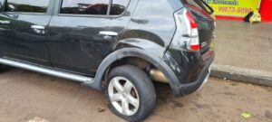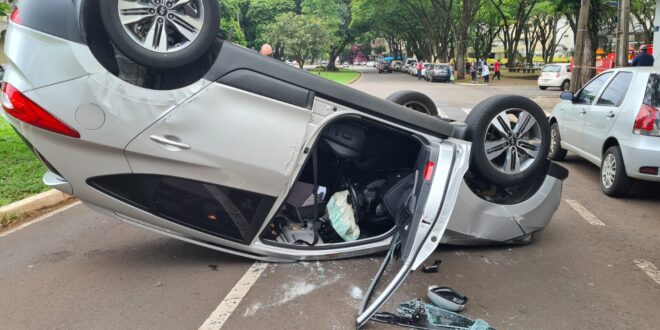 As informações são que o condutor do veículo após passar pela lombada perdeu o controle da direção e veio a colidir num Veículo que estava estacionado e em seguida capotou.