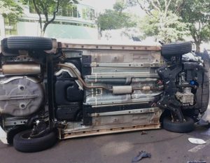 Um carro acabou colidindo na traseira de um veículo Peugeot 208, que estava estacionado, com o impacto o veículo que provocou o acidente veio a tombar.