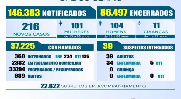 O boletim também indica 12 óbitos por complicações da covid-19. Confira as datas em que ocorreram os óbitos e perfis das vítimas: