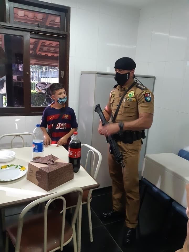 Um menino de 10 anos acabou ganhando um bolo e uma comemoração de aniversário nesta terça-feira (21), após dar bombons de presente a dois policiais militares em Curitiba. Um dos policiais era o Coronel Hudson Leôncio Teixeira, comandante de policiamento na capital paranaense ao qual teve uma passagem pelo 5° BPM de Londrina no ano de 2014 a 2015.