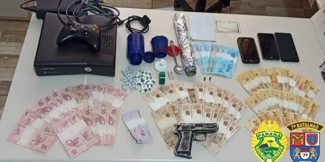 Ainda no período da tarde, desta vez na cidade de Goioerê, as equipes policiais de Radiopatrulha e do Serviço de Inteligência, realizavam diligências para localizar autores de um roubo ocorrido a uma sorveteria na noite anterior (18/08). Ao obter acesso às imagens das câmeras de monitoramento do local e informações anônimas, chegou-se a um suspeito e um endereço, onde a equipe teve acesso para realização de buscas. No local foram encontradas 5 porções de maconha embaladas em papel-alumínio, 27 buchas de cocaína e 32 “pedras” de crack, além da quantia de R$2.275,00 e um simulacro de pistola. Também durante as buscas, os policiais encontraram outros materiais utilizados para comercialização de entorpecentes, como balança de precisão, facas para corte e papéis para embalar. Dentre outros objetos suspeitos, foram localizados dois cartuchos de munição calibre 22 deflagrados, um videogame e aparelhos celulares, sendo um deles, produto do roubo à sorveteria.
