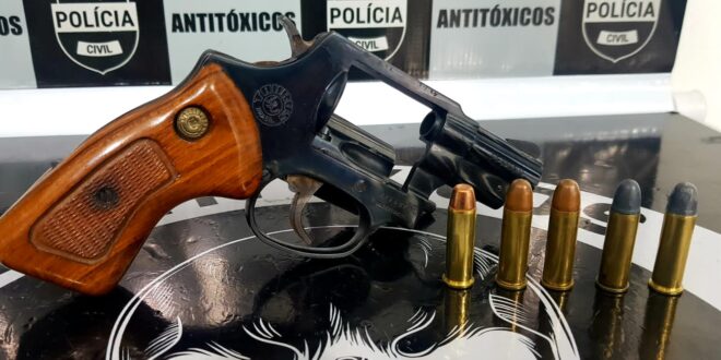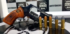 No local foram localizadas 01 revólver da marca Taurus, calibre 38 municiado com 05 munições intactas e uma porção de maconha.