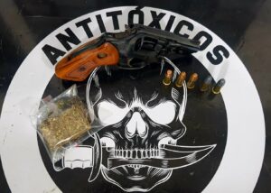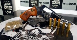 No local foram localizadas 01 revólver da marca Taurus, calibre 38 municiado com 05 munições intactas e uma porção de maconha.