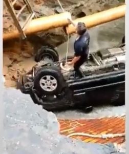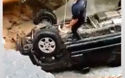 Condutor do veículo conseguiu sair do buraco com escada e corda