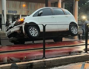 Um carro foi parar em cima de uma estrutura metálica da ciclovia que passa pela avenida. Tudo indica que o condutor teria perdido o controle do veículo onde sofreu o acidente.