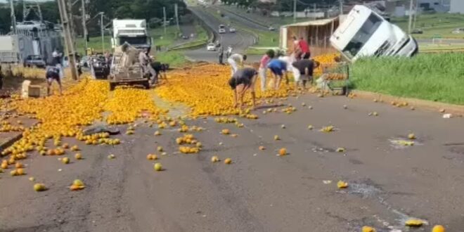 Apesar da cena impressionante, o condutor não se feriu. A carga se espalhou pela marginal da rodovia onde muitas pessoas aproveitaram para saquear.