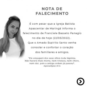 Foi confirmado nesta terça-feira (22), o falecimento da jovem maringaense Franciele Basseto Panagio, de 28 anos. De acordo com conhecidos, ela lutava contra uma leucemia que foi recentemente descoberta.