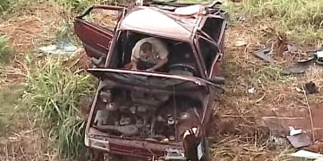 Um carro Fiat Uno ocupado por três pessoas acabou caído em um barranco e capotando na curva do entroncamento da PR-323 com a PR-317, durante a manhã desta quinta-feira (23), em Maringá.
