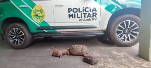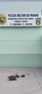 Durante o Programa V.I.G.I.A., por meio da Operação Hórus do Ministério da Justiça e Segurança Pública do Governo Federal, o efetivo do Batalhão de Polícia Ambiental – Força Verde da Polícia Militar do Paraná, empregado na Base Interestadual Trarbach, na data de 24/02/2022 recebeu uma denúncia anônima que estariam sendo vendidos jabutis filhotes no município de Cruzeiro do Oeste-PR, diante dos fatos, a equipe da Policia Ambiental Pelotão Umuarama, solicitou apoio a ALI do 7º BPM, para verificar se tal denúncia procederia, após diligências com as informações fornecidas pela Equipe Ambiental foi constatado pela ALI 7º BPM que numa propriedade rural haviam 12 jabutis. Desta forma, a equipe ambiental deslocou por volta das 13h até a propriedade e constatou que haviam 12 repteis da fauna silvestre nativa brasileira de nome popular jabuti, nome científico chelonoidis carbono ria, sendo 9 filhotes, que segundo os abordados “nasceram na data de ontem”, perguntado se possuíam alguma autorização aos responsáveis pelos animais, foi respondido que não. Lavrado o auto de infração ambiental com valor da multa de R$ 6.000,00 (seis mil reais), foi informado quanto aos procedimentos para exercício de ampla defesa e contraditório. Diante da conduta in tese praticada tipificada no art. 24 § 3 III do decreto federal 6.514/08, visto Lei Federal 9.605/98 art. 70, bem como art. 29 § 1º III. Foi lavrado o termo circunstanciado na esfera criminal. Foram apreendidos os 12 animais e destinados ao órgão ambiental competente.