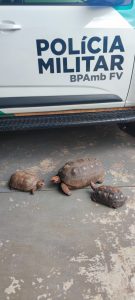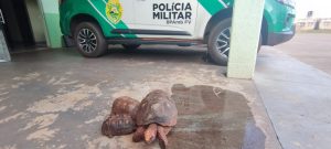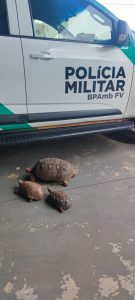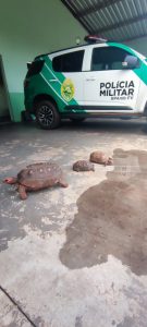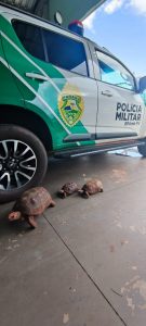 Durante o Programa V.I.G.I.A., por meio da Operação Hórus do Ministério da Justiça e Segurança Pública do Governo Federal, o efetivo do Batalhão de Polícia Ambiental – Força Verde da Polícia Militar do Paraná, empregado na Base Interestadual Trarbach, na data de 24/02/2022 recebeu uma denúncia anônima que estariam sendo vendidos jabutis filhotes no município de Cruzeiro do Oeste-PR, diante dos fatos, a equipe da Policia Ambiental Pelotão Umuarama, solicitou apoio a ALI do 7º BPM, para verificar se tal denúncia procederia, após diligências com as informações fornecidas pela Equipe Ambiental foi constatado pela ALI 7º BPM que numa propriedade rural haviam 12 jabutis. Desta forma, a equipe ambiental deslocou por volta das 13h até a propriedade e constatou que haviam 12 repteis da fauna silvestre nativa brasileira de nome popular jabuti, nome científico chelonoidis carbono ria, sendo 9 filhotes, que segundo os abordados “nasceram na data de ontem”, perguntado se possuíam alguma autorização aos responsáveis pelos animais, foi respondido que não. Lavrado o auto de infração ambiental com valor da multa de R$ 6.000,00 (seis mil reais), foi informado quanto aos procedimentos para exercício de ampla defesa e contraditório. Diante da conduta in tese praticada tipificada no art. 24 § 3 III do decreto federal 6.514/08, visto Lei Federal 9.605/98 art. 70, bem como art. 29 § 1º III. Foi lavrado o termo circunstanciado na esfera criminal. Foram apreendidos os 12 animais e destinados ao órgão ambiental competente.