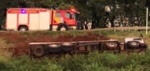 CAMINHÃO CAI EM BARRANCO, TOMBA E CONDUTOR ACABA FICANDO FERIDO EM MARINGÁ