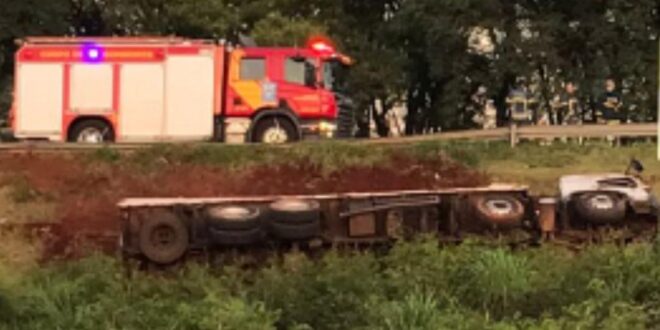 Um caminhão acabou tombando e caiu em uma barranco durante o final da madrugada desta sexta-feira (25), na PR-323, entroncamento com a PR-317, em Maringá. O caminhoneiro acabou ficando ferido e foi socorrido pelas equipes do Corpo de Bombeiros.