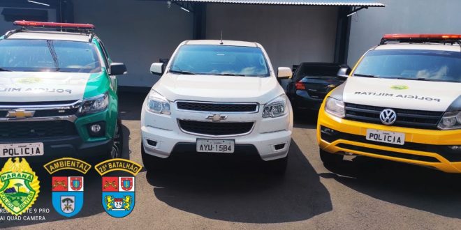 DURANTE O PROGRAMA VIGIA, POR MEIO DA OPERAÇÃO HORUS, DO MINISTÉRIO DA JUSTIÇA E SEGURANÇA PÚBLICA DO GOVERNO FEDERAL´, O EFETIVO DO BATALHÃO DE POLICIA AMBIENTAL FORÇA VERDE DA POLICIA MILITAR DO ESTADO DO PARANÁ EMPREGADO NA BASE INTERESTADUAL TRARBACH, POR VOLTA DAS 12H00MIN REALIZAVA PATRULHAMENTO TERRESTRES NO MUNICÍPIO DOURADINA-PR, QUANDO RECEBEU INFORMAÇÕES QUE UMA CAMIONETE S10 PLACAS AYU-1584 PRODUTO DE ROUBO CIDADE DE LONDRINA- PR ESTAVA EM DESLOCAMENTO PELA ROD. TAPIRA- PR – DOURADINA- PR , SENDO REALIZADO A ABORDAGEM DO REFERIDO VEICULO JUNTAMENTE COM EFETIVO DO 25 BPM DESTACAMENTO DE DOURADINA- PR, SENDO PRESO O CONDUTOR DO CARRO, O QUAL JUNTAMENTE COM O AUTOMOVEL ENCAMINHADO 7 SDP PARA SEREM ADOTADAS MEDIAS CABÍVEIS.