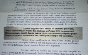 O pastor morreu na última sexta-feira (22) por complicações cardiorrespiratórias em um hospital de Itumbiara a 55 km de Goiatuba. No documento, assinado em 2008, o pastor releva que teve divinas revelações do Espirito Santo e que passaria por um “mistério de Deus”, onde ressuscitaria às 23h30 – três dias após sua morte. O prazo termina na noite desta segunda-feira (25).