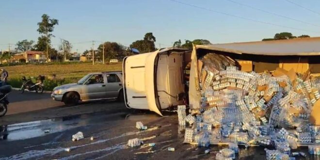 Uma carreta carregada com cervejas acabou tombando no Anel Viário Prefeito Sinclair sabatti, Contorno Sul de Maringá, bem na rotatória com a Av Carlos Correia Borges, durante a tarde desta quarta-feira (26).