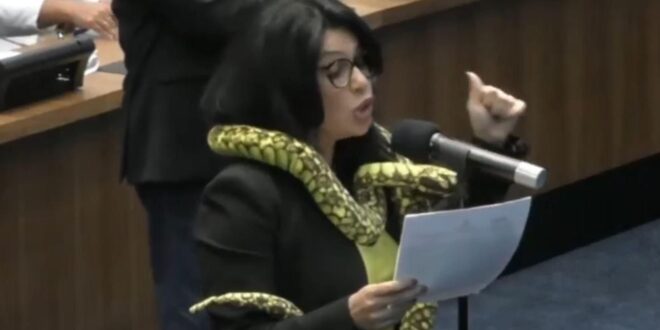 DEPUTADA APARECE EM SESSÃO DE ASSEMBLEIA COM COBRA DE PELÚCIA NO OMBRO
