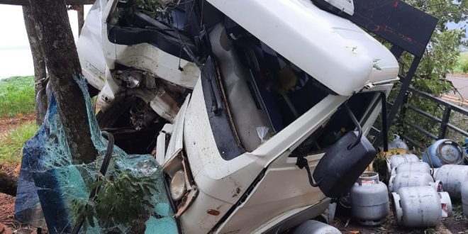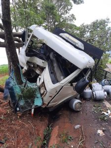 Relato: Conforme vestígios encontrados no local e declaração do condutor do caminhão, trafegava o caminhão VW/8.150, placa de Londrina/PR, com aproximadamente 140 botijões de gás GLP pela rodovia PR 496 no sentido Pérola á Altônia quando a proximidade do km 06 + 800m o volante travou vindo a chocar-se com uma arvore as margens direita da pista base seu sentido de trafego, ato continuo alguns botijoes de gas ficaram espalhados pela rodovia estadual onde veio o veiculo Renault/Captur, placa de Umuarama/PR, acabou atingindo alguns botijões. Do acidente resultou apenas em danos materiais nos veículos. A pista ficou interditada em uma das vias ficando no sistema pare/siga pelo tempo de 01h ate que fosse cortado uma arvore que estava bloqueando a pista.