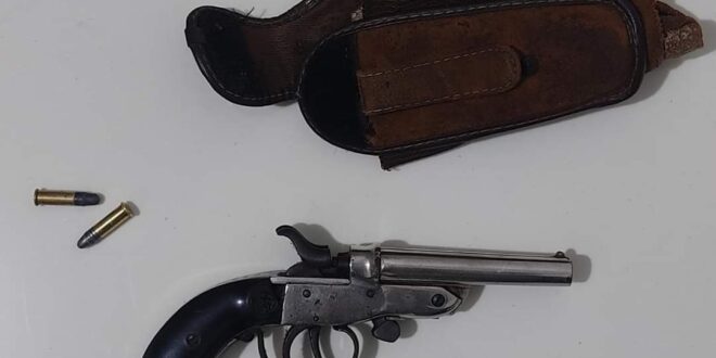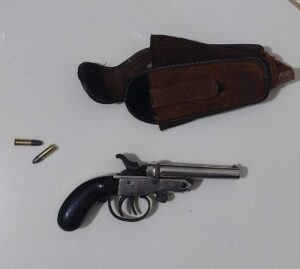 Os policiais mantiveram as buscas e após cerca de 15 minutos, foi localizado o homem escondido em meio a vegetação. Após abordagem e buscas pelo local, foi encontrado uma arma de fogo tipo garrucha calibre .22, de cano duplo, com duas munições intactas, num coldre de couro.