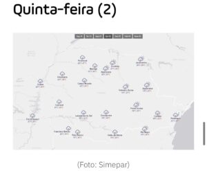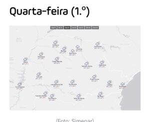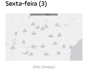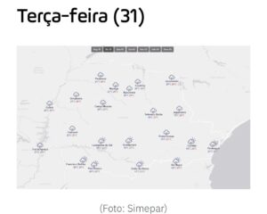Ainda de acordo com o Simepar, nesta segunda-feira (30), os termômetros podem marcar uma temperatura máxima de 29° C que deve ser registrada em Paranavaí, no noroeste do Paraná.