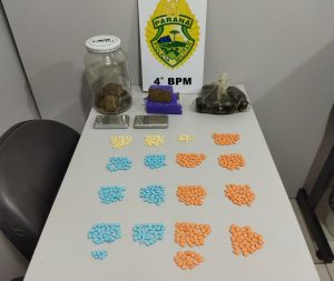 E equipe ROTAM de Maringá, durante operação saturação, na cidade de Sarandi, prendeu um casal, na posse de 835g de Haxixe, 450g de maconha, quase 500 comprimidos de Ecstasy e duas balanças de precisão, além de um veículo com alerta de furto e placas adulteradas.