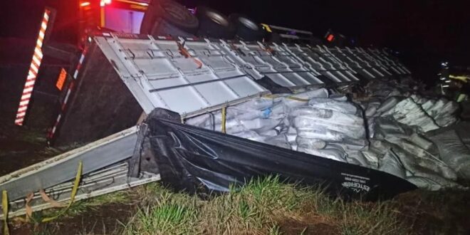 Carreta carregada com sacos de maravalha tombou no quilômetro 74 da BR 467 próximo a entrada da comunidade de Vista Alegre em Toledo, na noite de domingo (30).