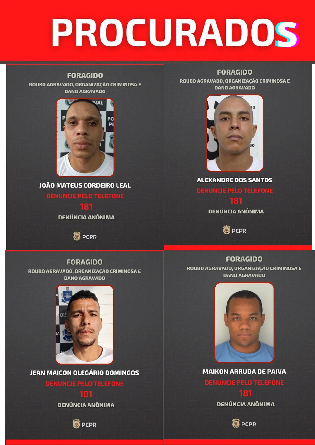 Leia mais »Polícia divulga fotos de foragidos suspeitos de envolvimento em protestos violentos no PR Os procurados possuem antecedentes criminais por homicídio, roubo, associação criminosa, corrupção de menores e outros crimes